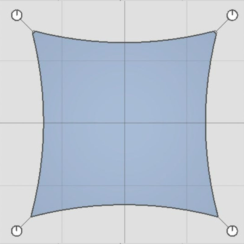 With opposite corners at a low height, and the other pair at a higher position, a "twist" or "saddle" shape is introduced. This locks the sail in place against wind. The 3D shape of the sail displays triangular sections while still providing solid shade coverage for the area beneath.