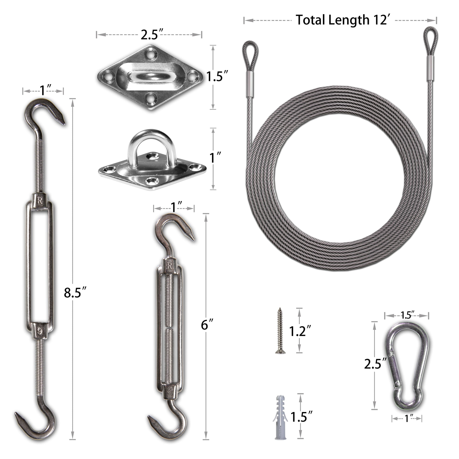 Perfect Set for Installation: Our Square/Rectangle Sun Shade Sail Hardware Installation Kit contains 40 component pcs: 2 x Turnbuckle, 2 x Snap Hook, 4 x Pad Eye, 16 x Screw, 16 x Plastic Expansion Anchor, 4 x 12' Wire Rope, everything you need to set up your square or rectangle sun shade sail.