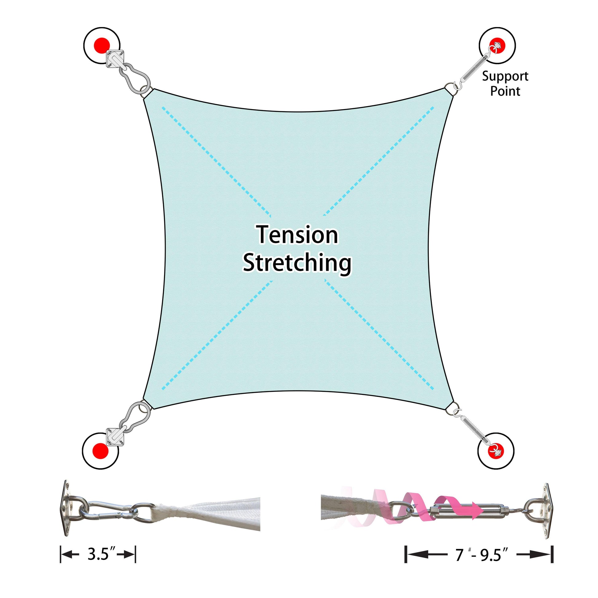 Adjustable Tension: The length of the turnbuckle can be adjusted from?6 inches to?8.5 inches. By tightening the turnbuckle to generate tension, you can choose how far your shade sail is from the fixing wall/post/point.