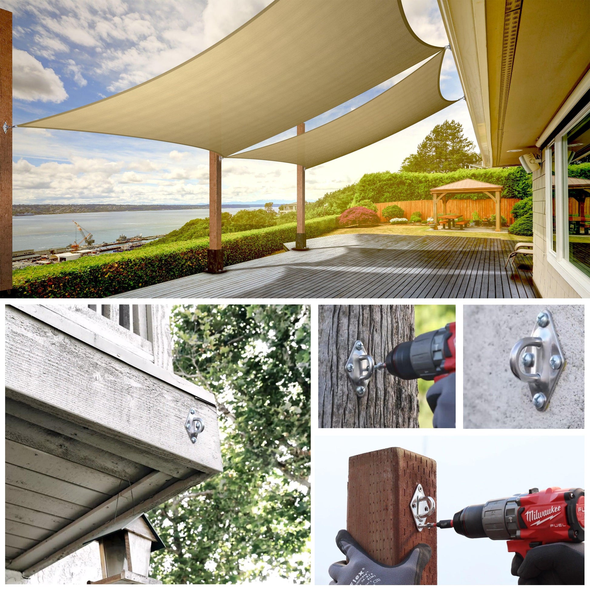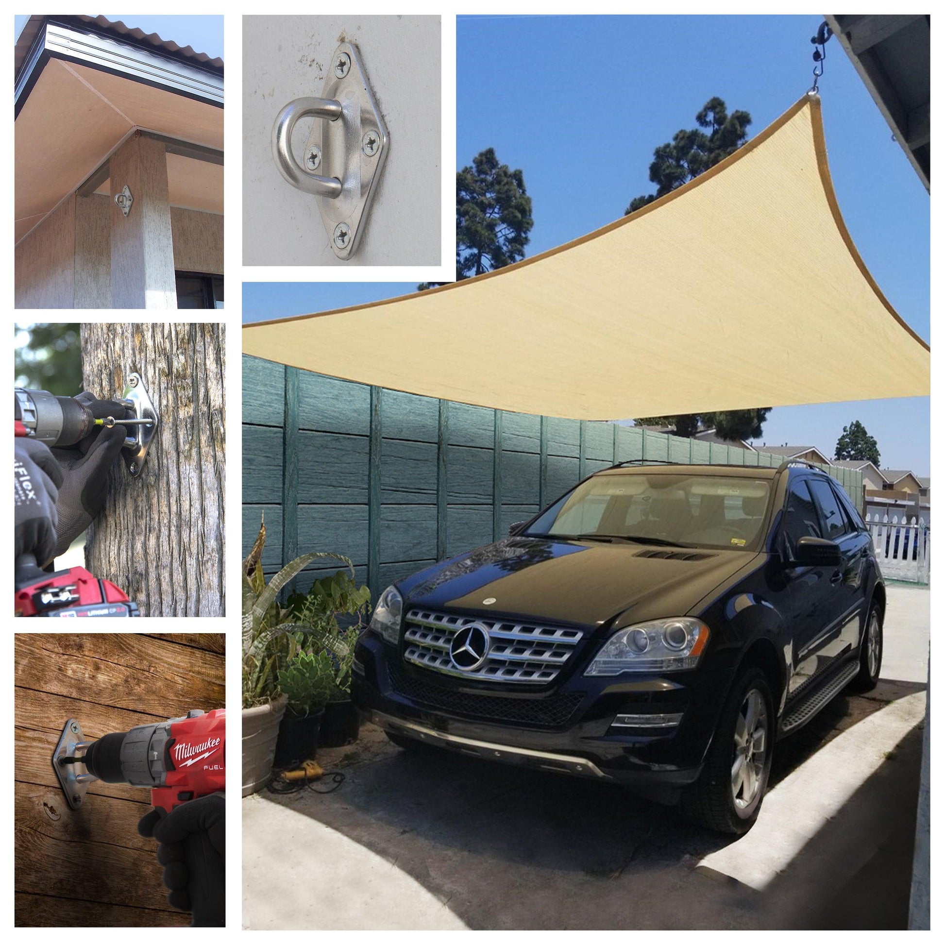 Wide Application: The sun shade sail installation kit stainless steel has rust-proof properties making it suitable for extended outdoor use. A great fit for installing all square or rectangle sun shade sails and you can mount it in a variety of ways: between trees, wall to wall, wall to tree, wall to poles, fascia to poles, etc.